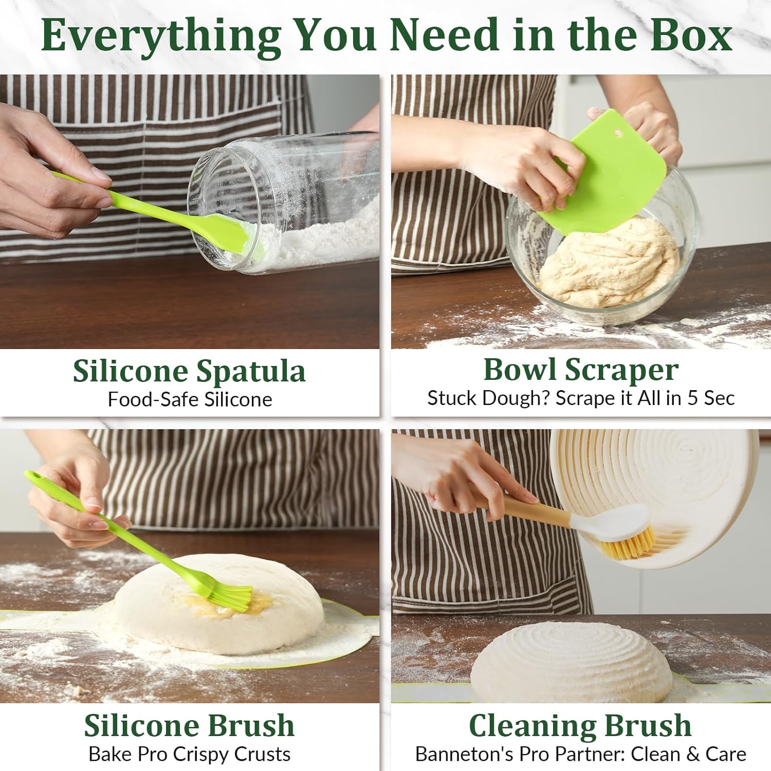 9-in-1 Sourdough Kit – Ultimate Baking Set with Banneton Basket, Lame, Scrapers & More Includes: 9″ Round Banneton Basket (Linen Liner), Silicone Bread Sling, Bread Lame +5 Blades, Dough Whisk, Dough Scraper, Bowl Scraper, Silicone Brush, Cleaning Brush, Silicone Spatula. Bake artisan sourdough bread & pastries effortlessly – all tools in one box.