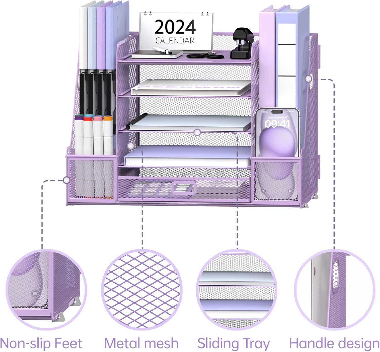 SUPEASY Mesh Desk Organizer with File Holder, 5-Tier Paper Letter Tray Organizer with Magazine Holder, Desktop Organizer and Storage with Drawer for Office Supplies Home or School, Purple