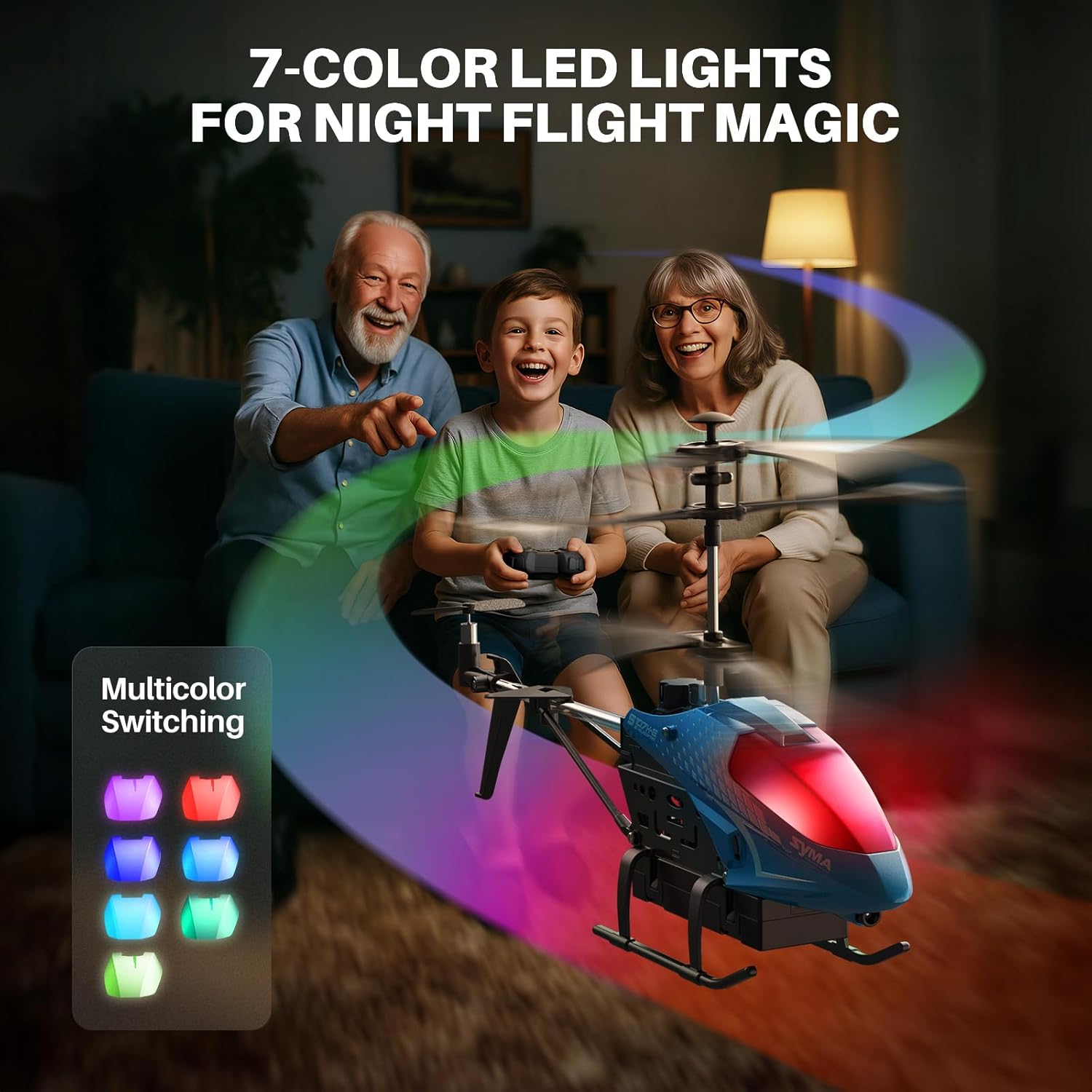 Colorful Lights & Stunt Performances : The helicopter features a 7-color LED light on the nose, making night flights visually stunning. With the one-key stunt mode, it can perform elegant spins or perfect circles, adding excitement to family gatherings, birthday parties, or community events.