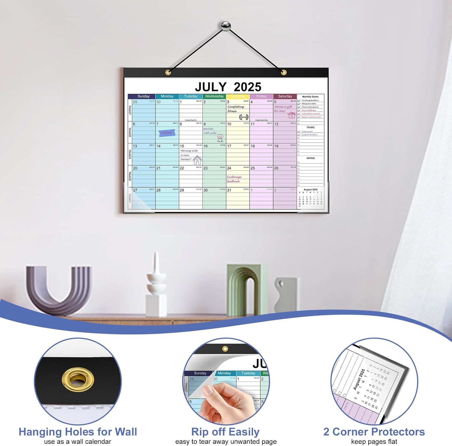 Timart Desk Calendar 2025-2026, 18 months calendar runs from July 2025 to December 2026, large 17″ x 12″ desktop/wall monthly calendar with to-do list. Designed for daily use, this desk calendar features a waterproof cover, reinforced corners, and sturdy backing for writing stability. It includes perforated pages for easy tear-off, two hanging holes for wall display, and a strong black binding for lasting performance. Perfect for Home School, Office.
