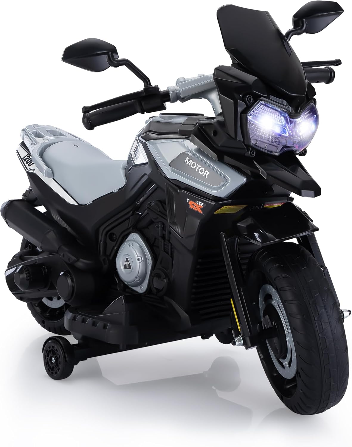 TOBBI 12V Electric Motorcycle for Kids Ride on Toys Motorbike Battery Powered Off-Road Dirt Bikes w/Music/Headlights/Training Wheels, Gift for Boys & Girls, Silver