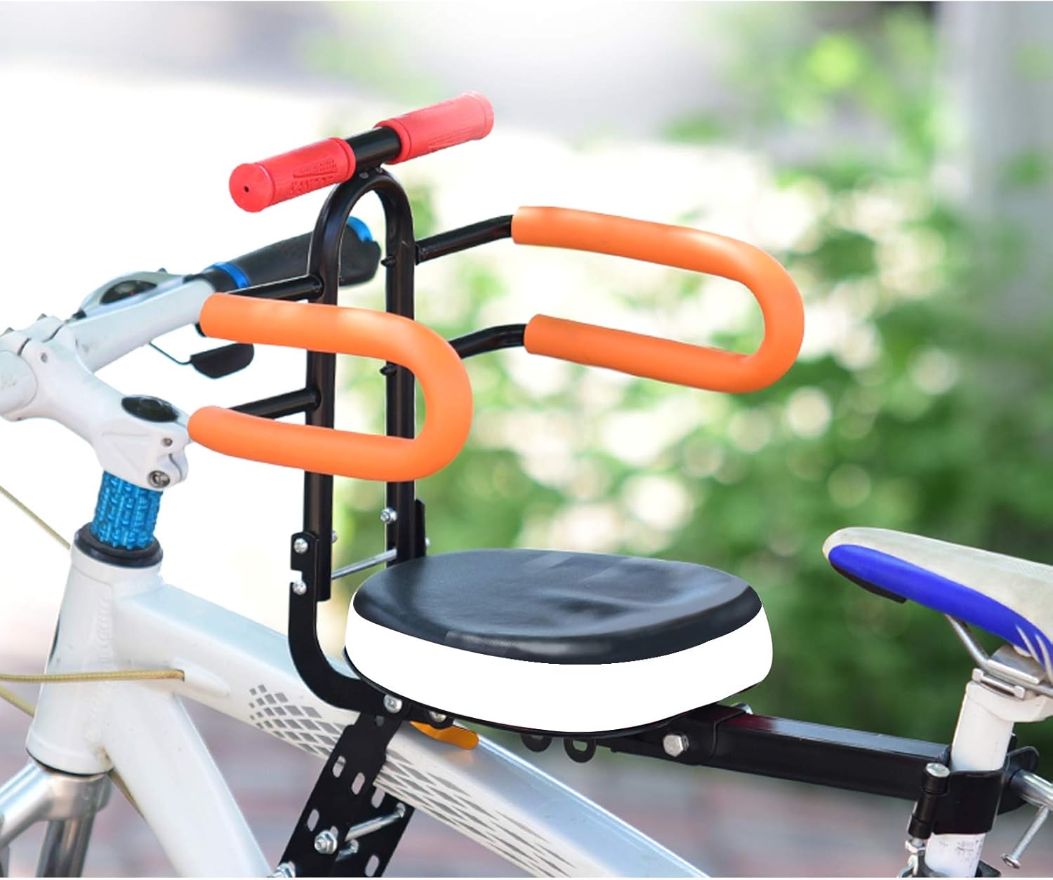【Safe &Comfortable】Thick padded cushion provides comfort, skidproof armrest and pedal design keep children safe and ensures a comfortable riding position. This bicycle front seat allows you to keep an eye on your child and the road at the same time.