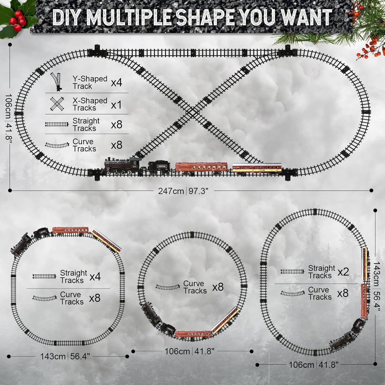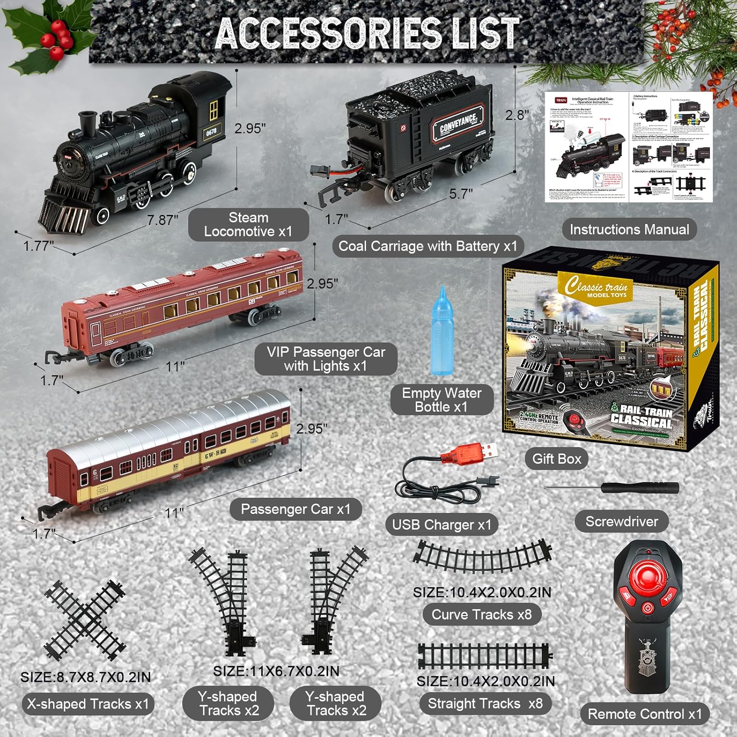 2025 New Version Luxury Train Set: Our RC Christmas train set consists of 1*remote controller(upgraded vision), 1*steam locomotive, 1*coal carriage, 2*passenger carriages(one with lights), 8*curved tracks, 8*straight tracks, 4*Y-shape tracks, 1*cross track, 1*screwdriver and 1*installation. The train toys are equipped with a 1000mah (3.7v) rechargeable lithium battery and a USB charging cable. Once fully charged, the fully-outfitted toy train can run around the Christmas tree, allowing your child to enjoy hours of happy train journey.