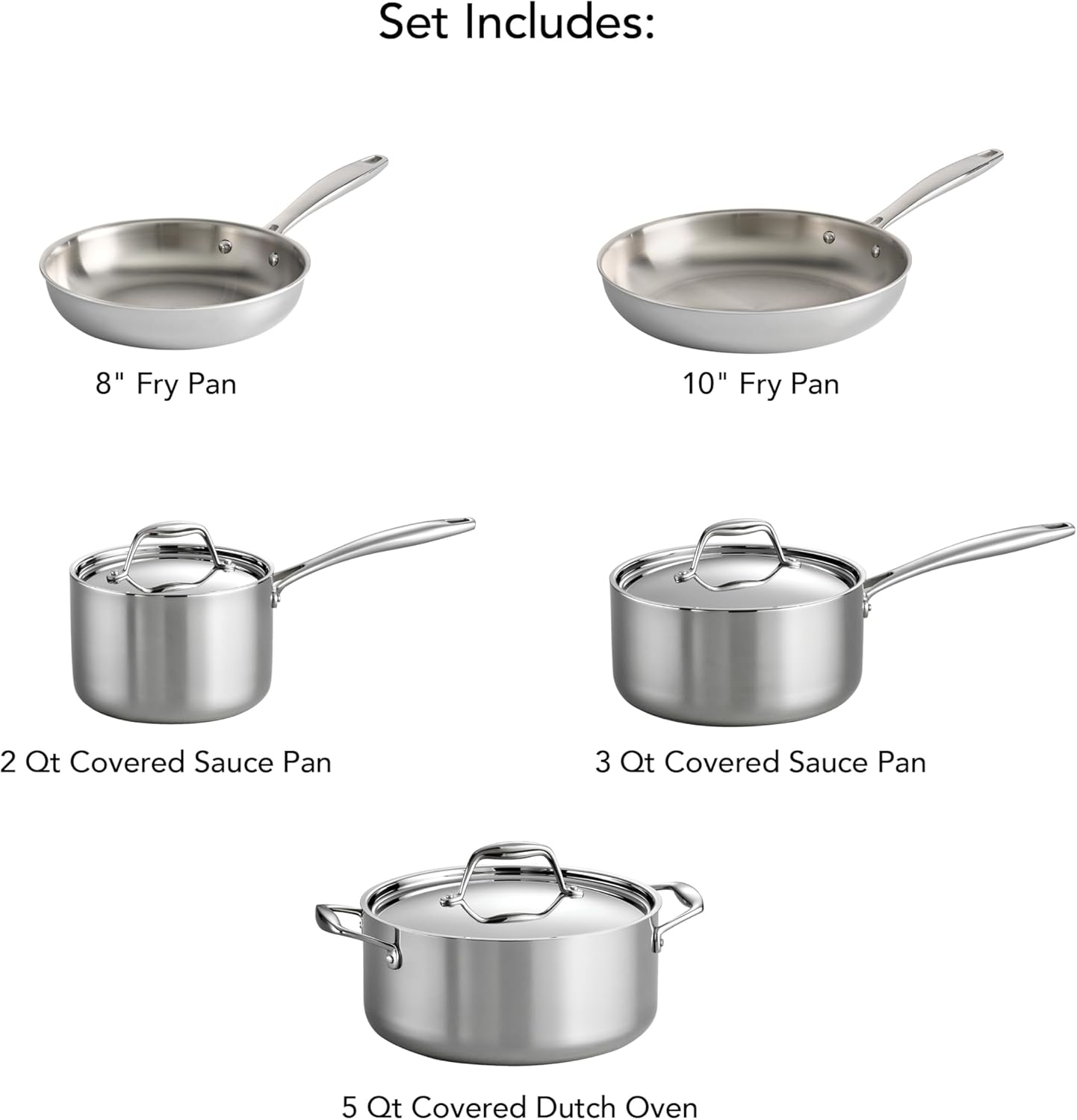 Introducing the Tramontina 8-Piece Tri-Ply Clad Stainless Steel Cookware Set—designed with tri-ply construction for superior performance. The aluminum core, surrounded by two layers of durable 18/10 stainless steel, ensures even heat distribution, reducing hot spots and giving you precise control over your cooking. This versatile, all-clad set includes two saucepans, a Dutch oven, and two fry pans, all with stainless steel lids. Ideal for everything from simmering soups to sautéing vegetables, it’s perfect for daily meals or special gatherings. It’s safe for use on all cooktops, including induction, and oven-safe up to 500°F. The riveted stainless steel handles provide a comfortable, secure grip. With a sleek, mirror-polished finish and NSF certification for safety, this cladded cookware set offers both style and performance. Dishwasher-safe for convenience, though handwashing is recommended for longevity.