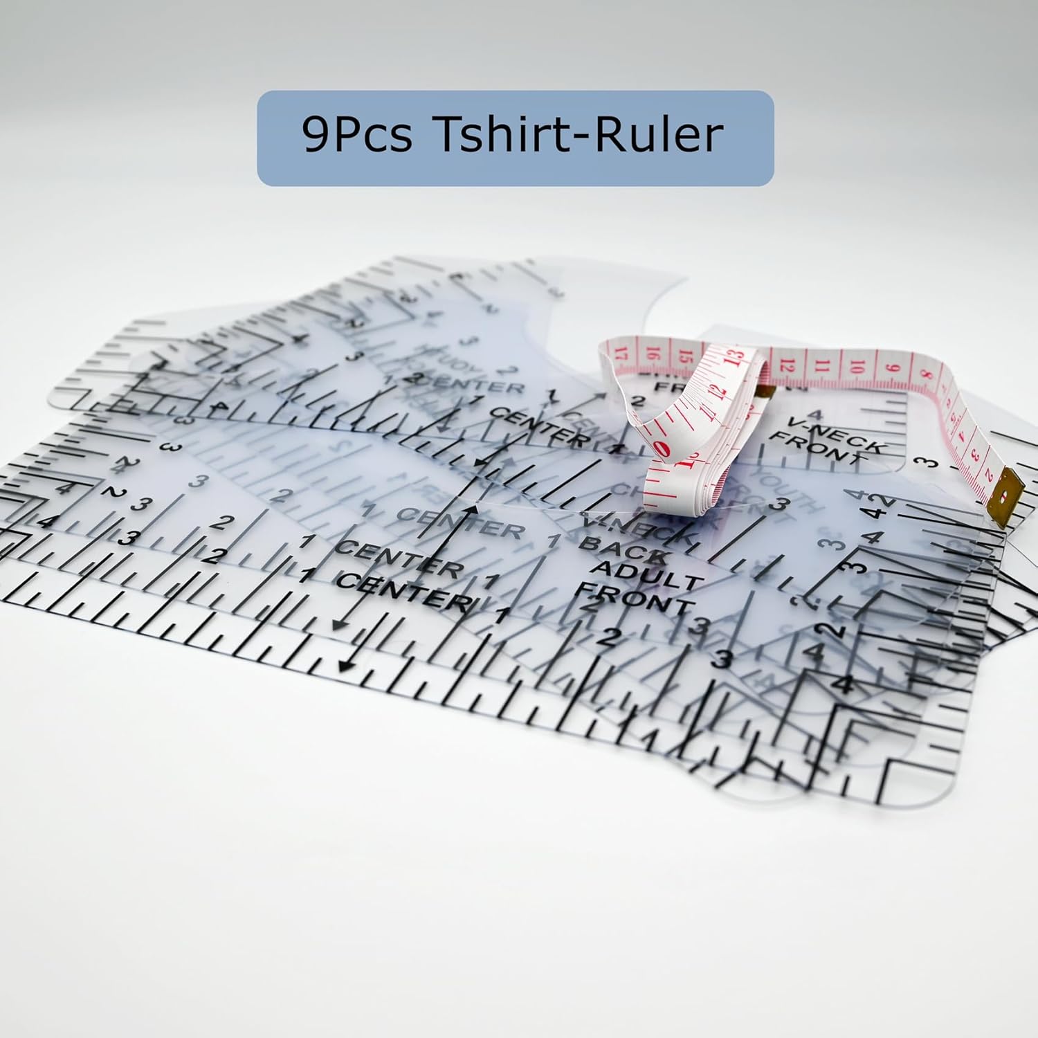 Tshirt Ruler Guide:The T-shirt ruler guide includes 8 rulers of different sizes and 1 soft tape measure
