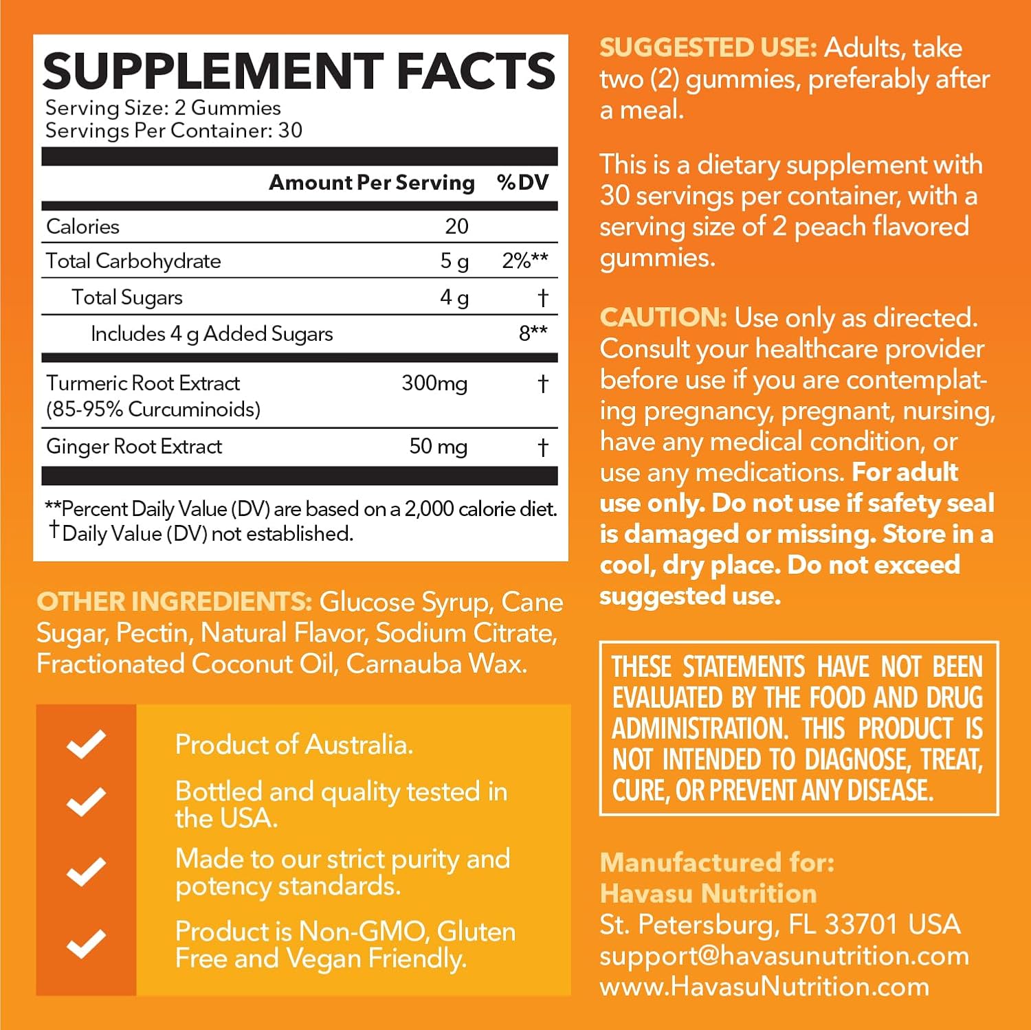 Delicious & Vegan-Friendly – Enjoy peach-flavored turmeric and ginger gummies made with non-GMO, vegan ingredients, ensuring a tasty and convenient way to support your health without artificial fillers or preservatives.
