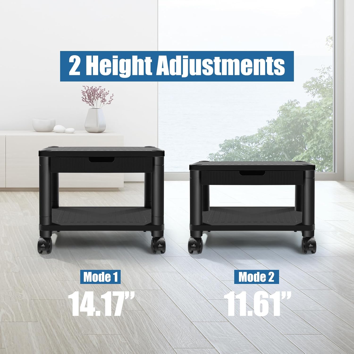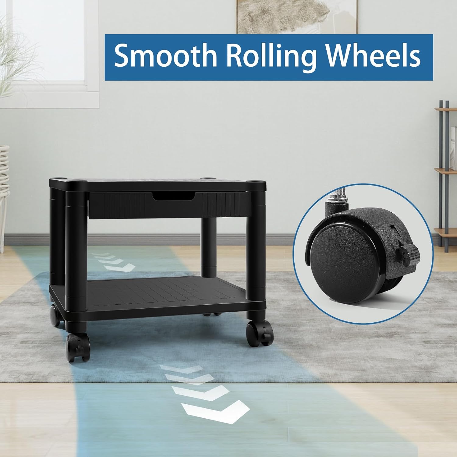 Versatile for Any Room More than just a printer stand—it doubles as a kitchen organizer, side table, nightstand, and more. Perfect for your home office, kitchen, bedroom, or living room. The sleek black design blends with any décor and never goes out of style.