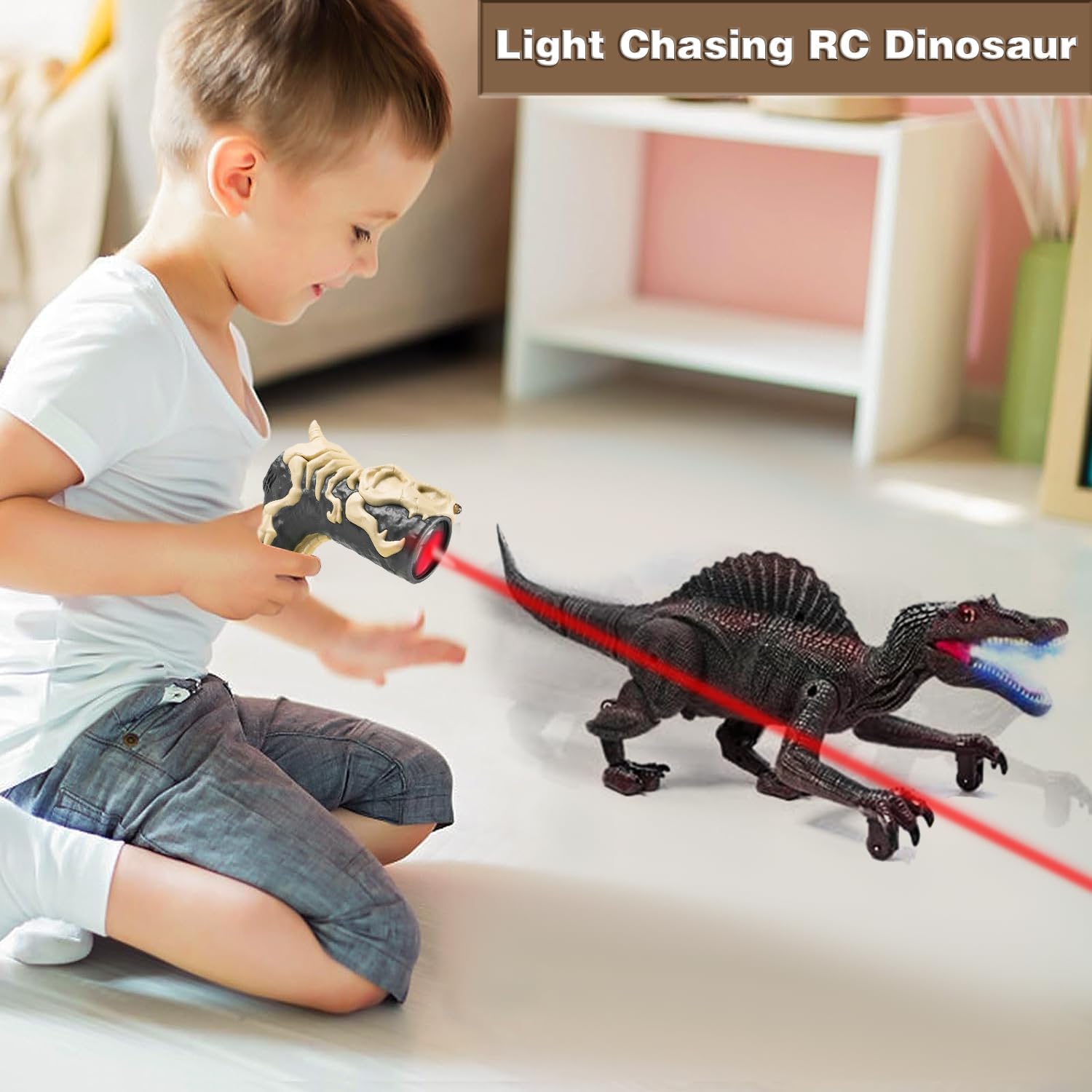 Multi-Functional Dinosaur Fun: Just pull the trigger on the remote to emit a red light and watch as the Spinosaurus lifts its legs and chases the light step by step! Unlike other remote-controlled dinosaurs, this Spinosaurus can walk forward and backward, track light sources, spray water mist, and roar while emitting a cool blue light. You can also operate it using button mode. It’s like having a real Spinosaurus right in your living room!