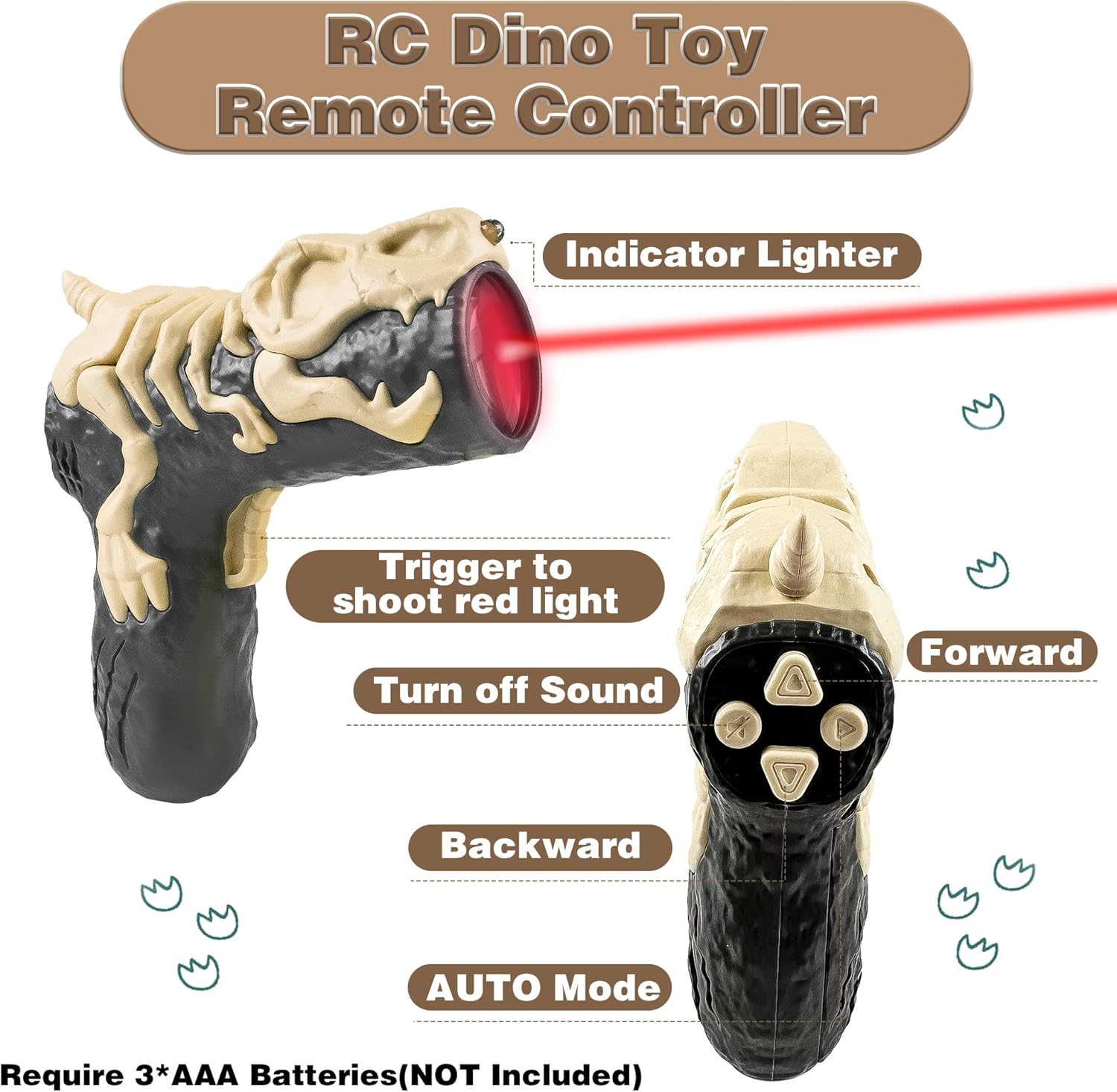 Within a straight line of 0.98 ft in front of the dinosaur, it will move forward as the red light is projected, while also automatically spraying mist and emitting realistic roars, with its mouth glowing blue. When the light is aimed at a straight line of 0.98 ft behind the dinosaur, it will spin in circles while continuing to spray mist and roar, with its mouth also glowing blue