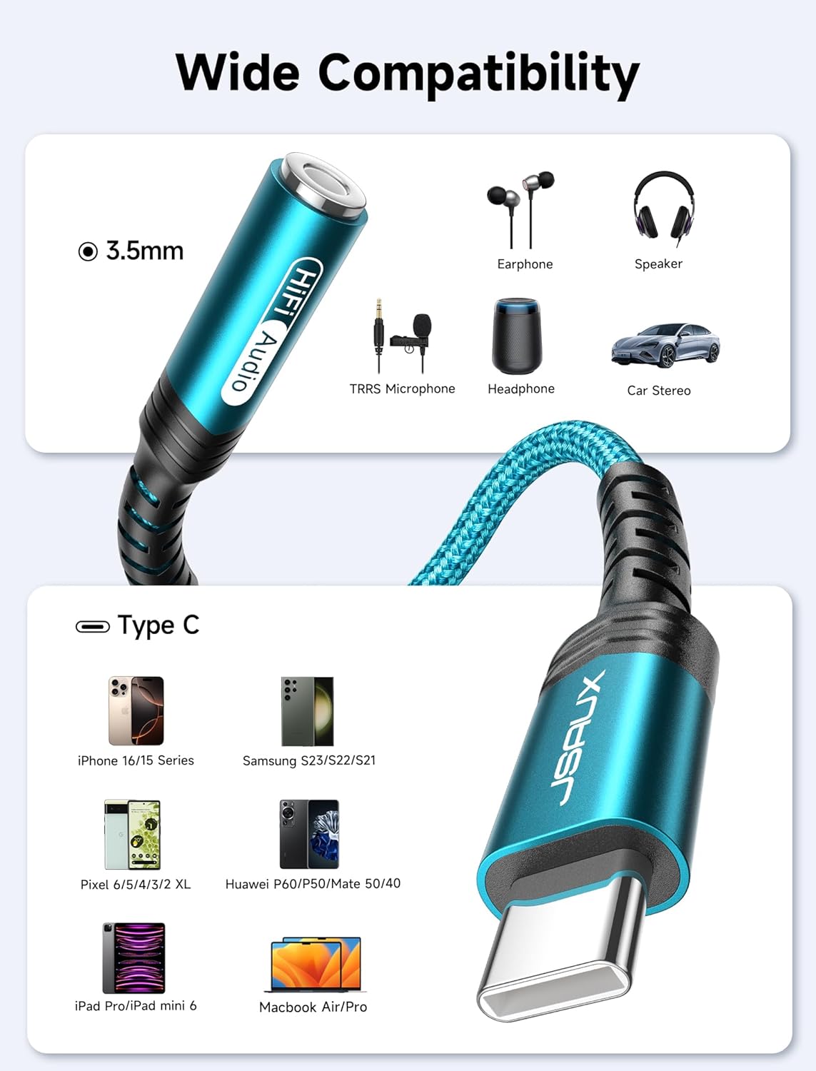 【Perfect Compatibility】: JSAUX USB Type-C headphone adapter is compatible with most USB C devices, including models for iPhone (16 / 16 Plus / 16 Pro / 16 Pro Max, 15 / 15 Plus / 15 Pro / 15 Pro Max), for Samsung Galaxy (S24/S24+/S24 Ultra, S23 series, S22 series, S21 series, S20 Ultra, S20+, Z Flip, S10, S9, S8 Plus, Note 20/10/10+/9/8), for iPad Pro, for iPad mini 6, for MacBook, for Pixel (8 / 7 / 6), for Huawei Mate (60/50/40/30/20/10 and Pro), for Huawei P series (P60/P50/P40/P30/P20 and Pro), for OnePlus (6T / 7 / 7 Pro), and more