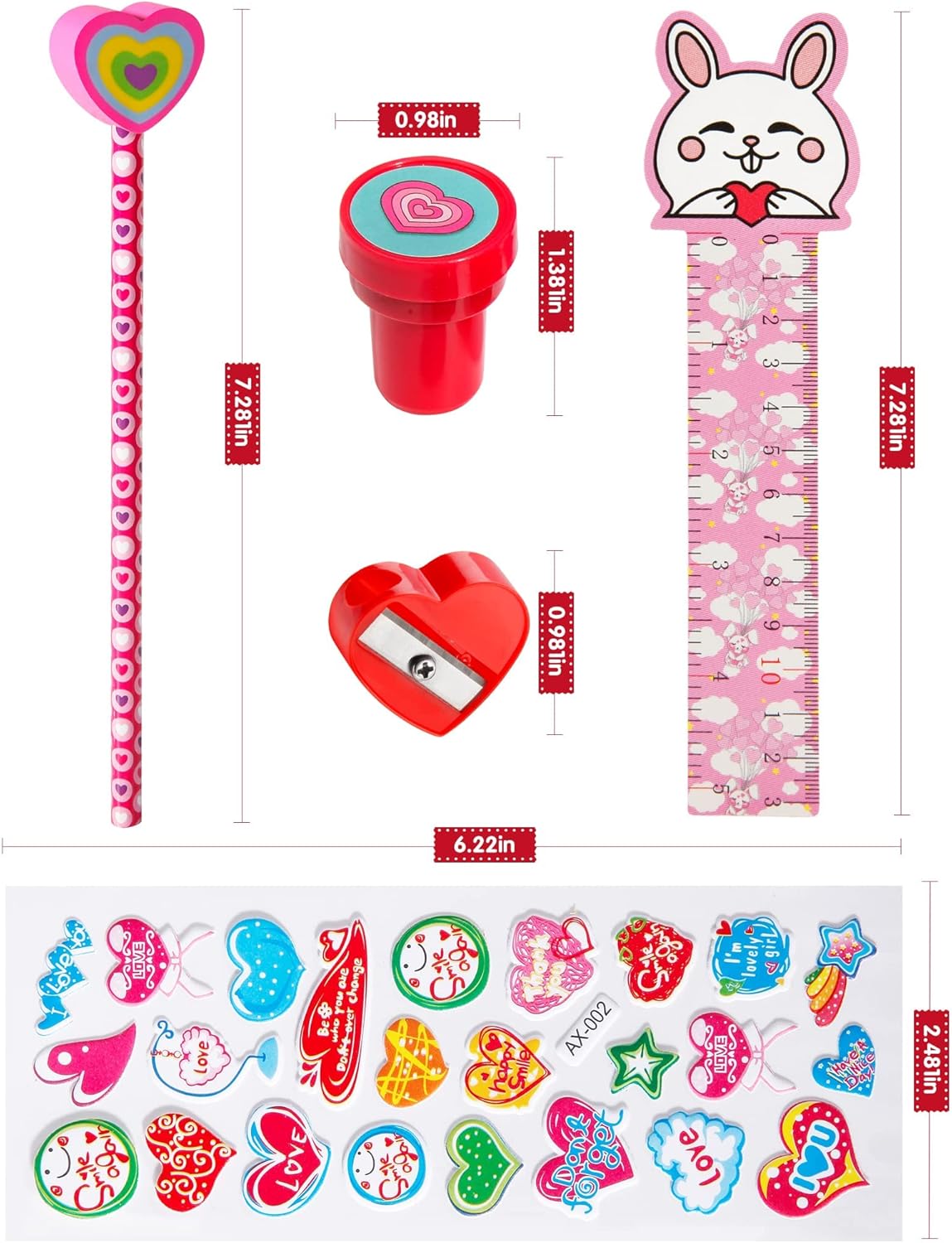 【Valentines Party Favor for Kids】28 Packs presents for your best friends. Each pack of Valentines’ Stationery includes 1 Valentines pencil with heart eraser, 1 Valentines heart Card, 1 Valentines ruler, 1 Valentines heart pencil sharpener, 1 Valentines seal, 1 Valentines stickers, 1 Valentines paperclip.