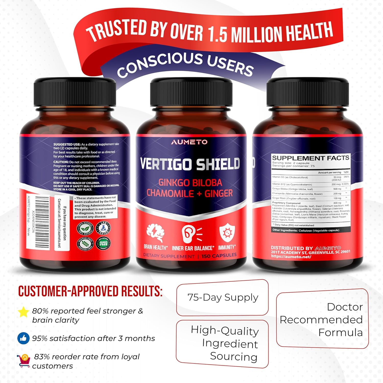 Ever feel slightly off balance or mentally foggy during the day? You’re not alone. Daily stress and sensory overload can leave you feeling out of sync. That’s why we created AUMETO Vertigo Shield—a targeted formula with Ginkgo Biloba, Chamomile, Ginger, and essential vitamins B12 and D3 to support clarity, balance, and inner calm.* We’ve also included a calming blend of Peppermint, Lavender, Valerian, Ashwagandha, Cordyceps, and Lion’s Mane to help you stay centered and focused.* With 150 clean, non-GMO capsules, Vertigo Shield is your everyday ally for supporting brain function, sensory wellness, and overall peace of mind.*