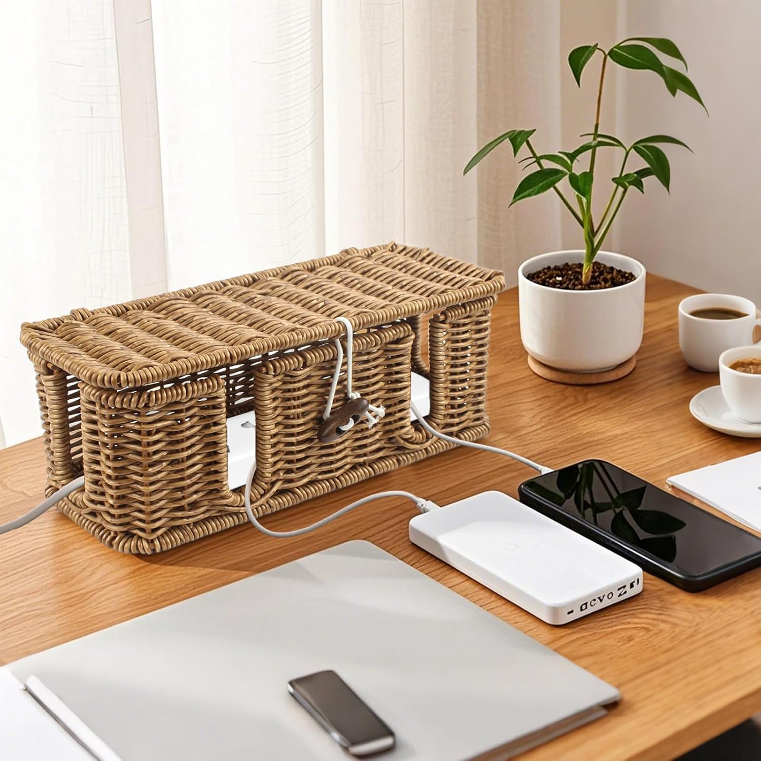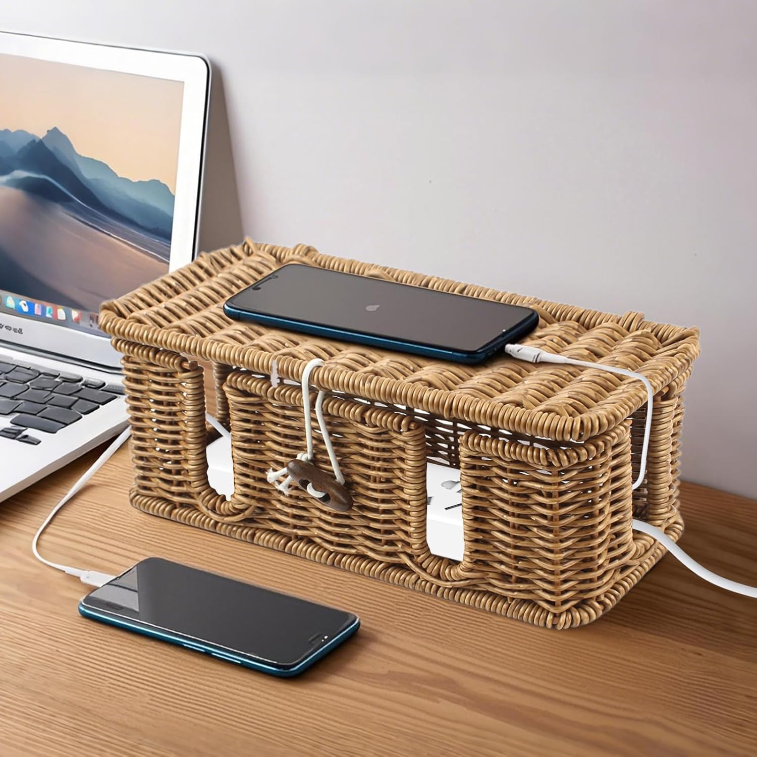 HAND-WOVEN TECHNIQUE: Cable organizer box is hand-woven with imitation rattan and has 4 open wire grooves. The unique weaving process improves breathability, improves safety, and is safe to use.