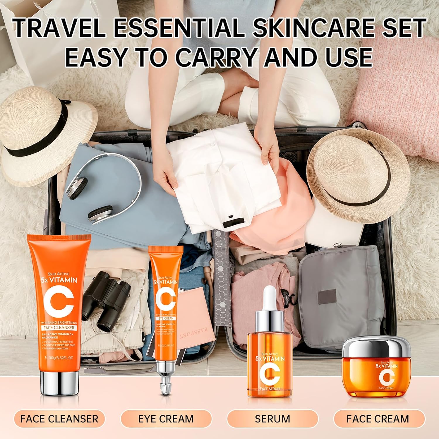 Travel Moisturizing Skincare Set: This skincare set contains the essential moisturizing products for travel: including facial cleanser, eye cream, serum and face cream, whicht hydrates dry skin, nourishes and moisturizes your skin, then allows you to achieve exquisite skin care while traveling