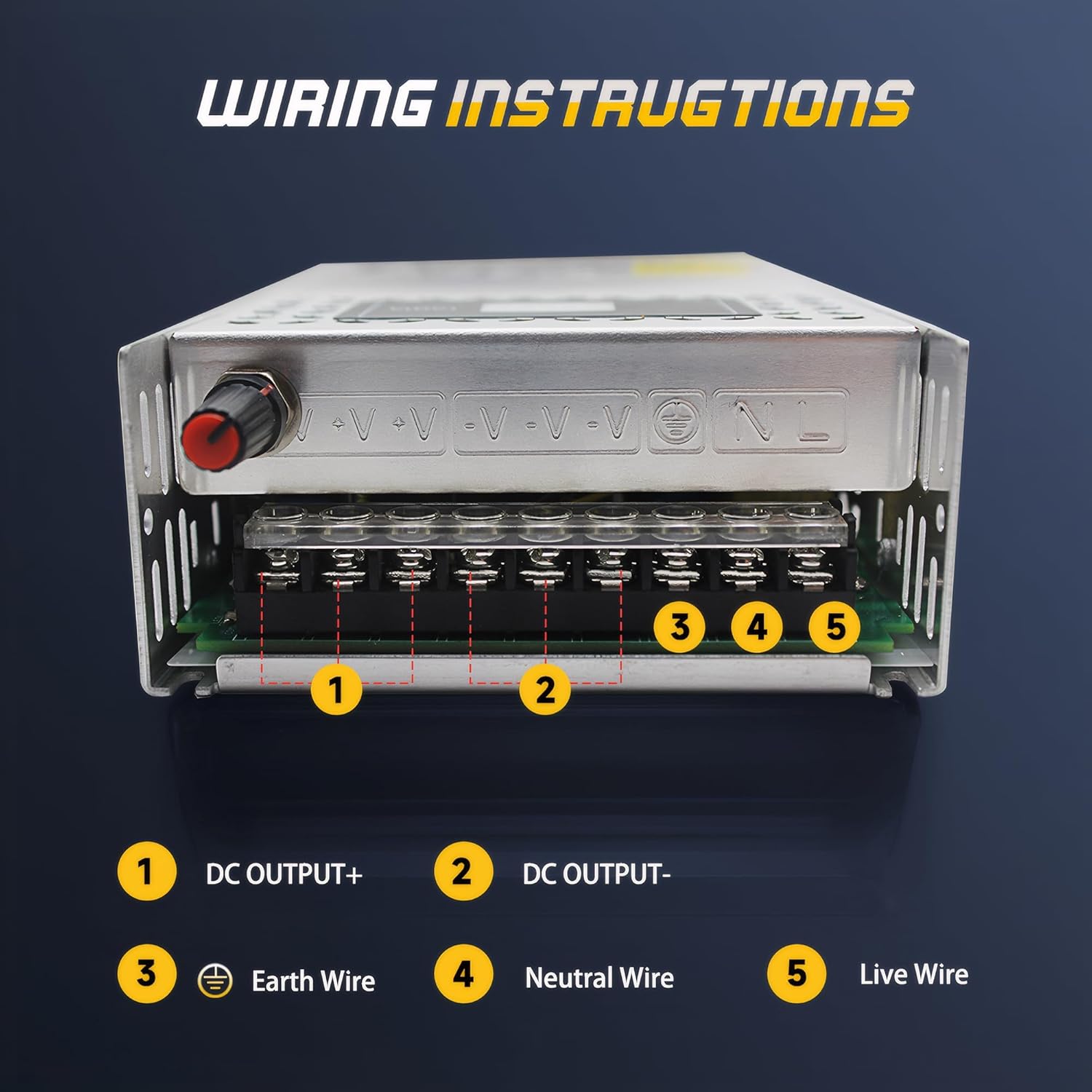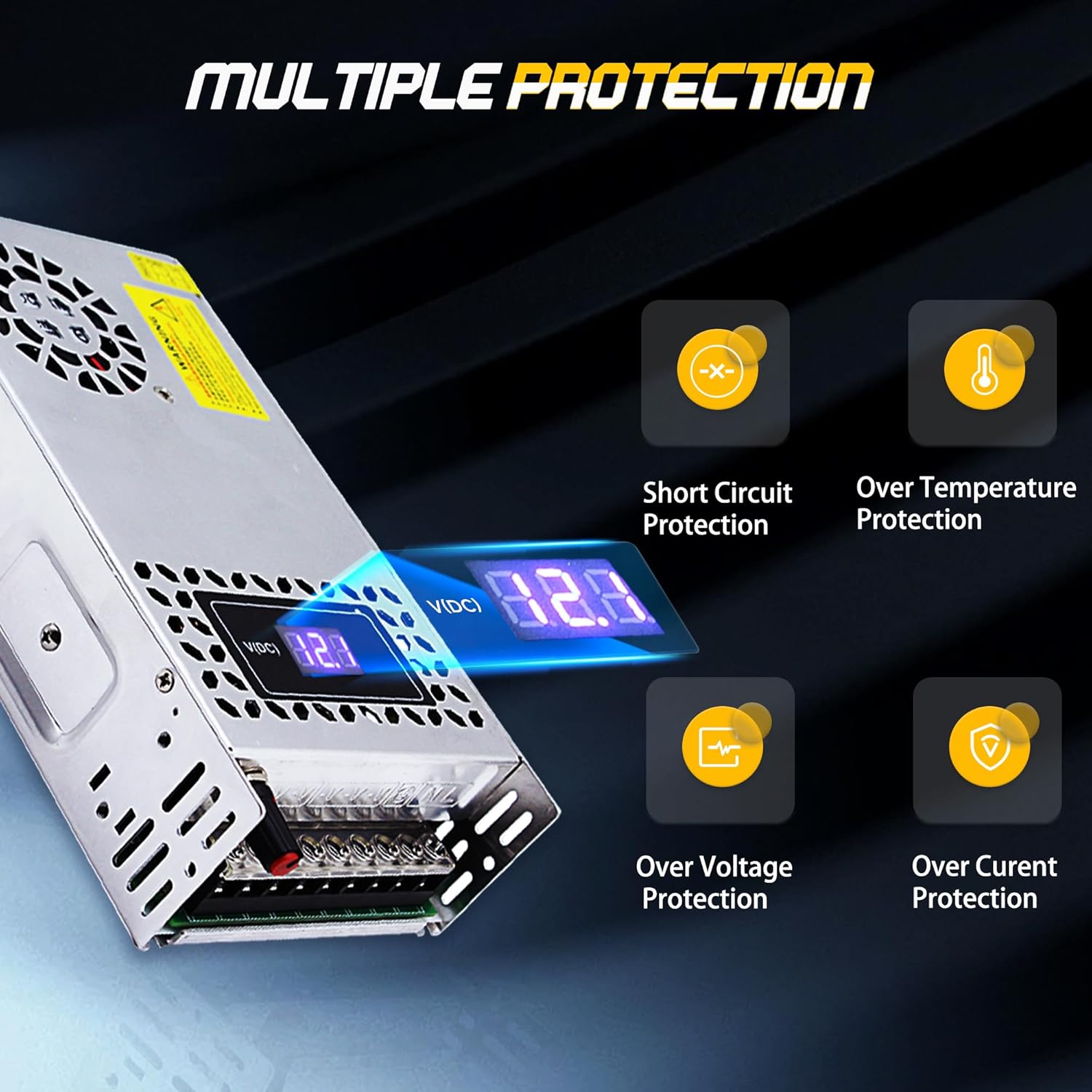 【Adjustable Power Supply with LED Display】Want to easily adjust the voltage? Try our knob-controlled 12V dc power supply variable, just gently rotate the knob and the output voltage can be freely switched between 0-12V. Featuring a clear and bright digital display, it shows you the exact voltage you’ve set, making operation simple and intuitive.The rated power is up to 600W, with a maximum current of 50A, and the actual current is automatically adjusted according to the load.