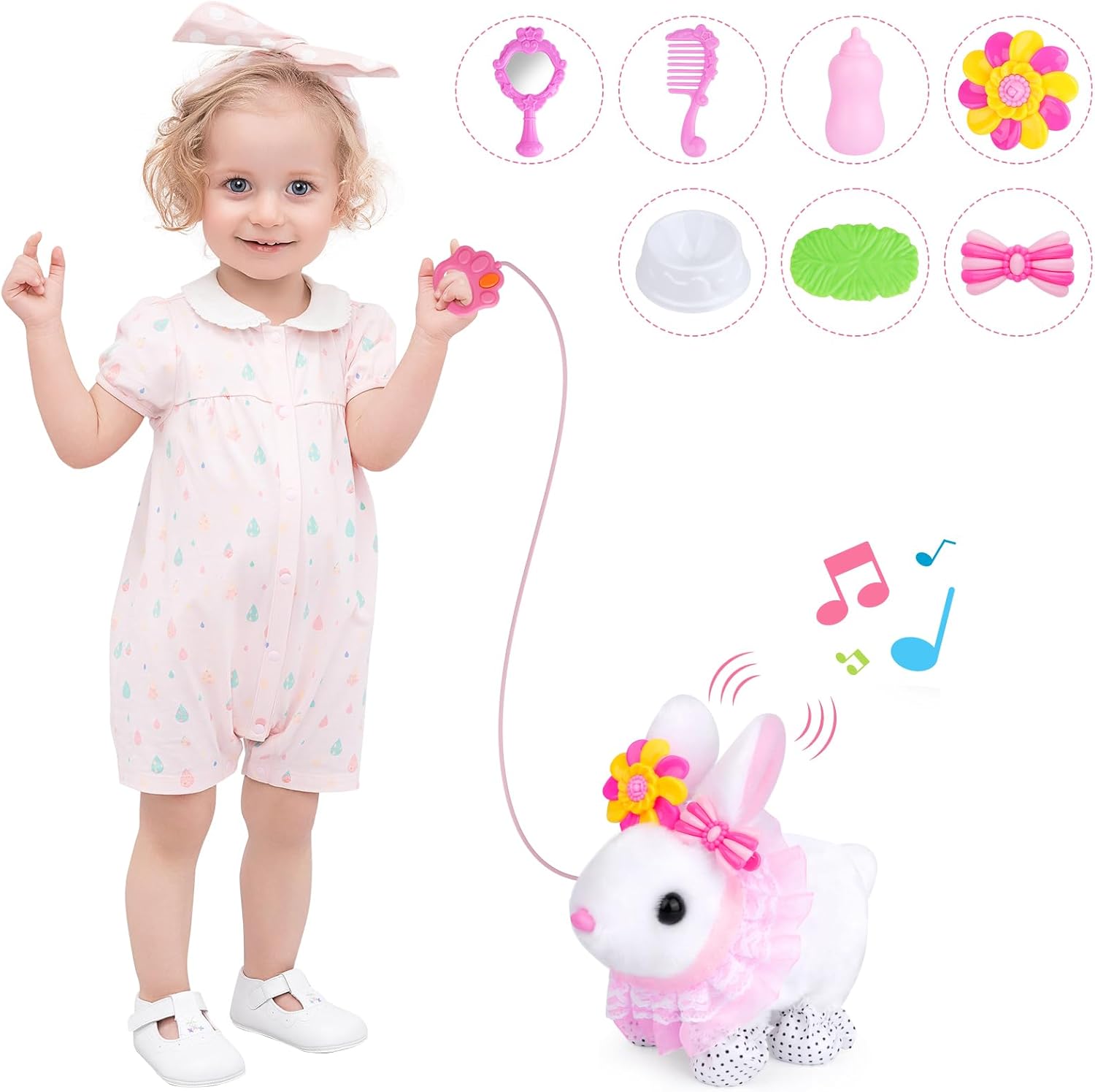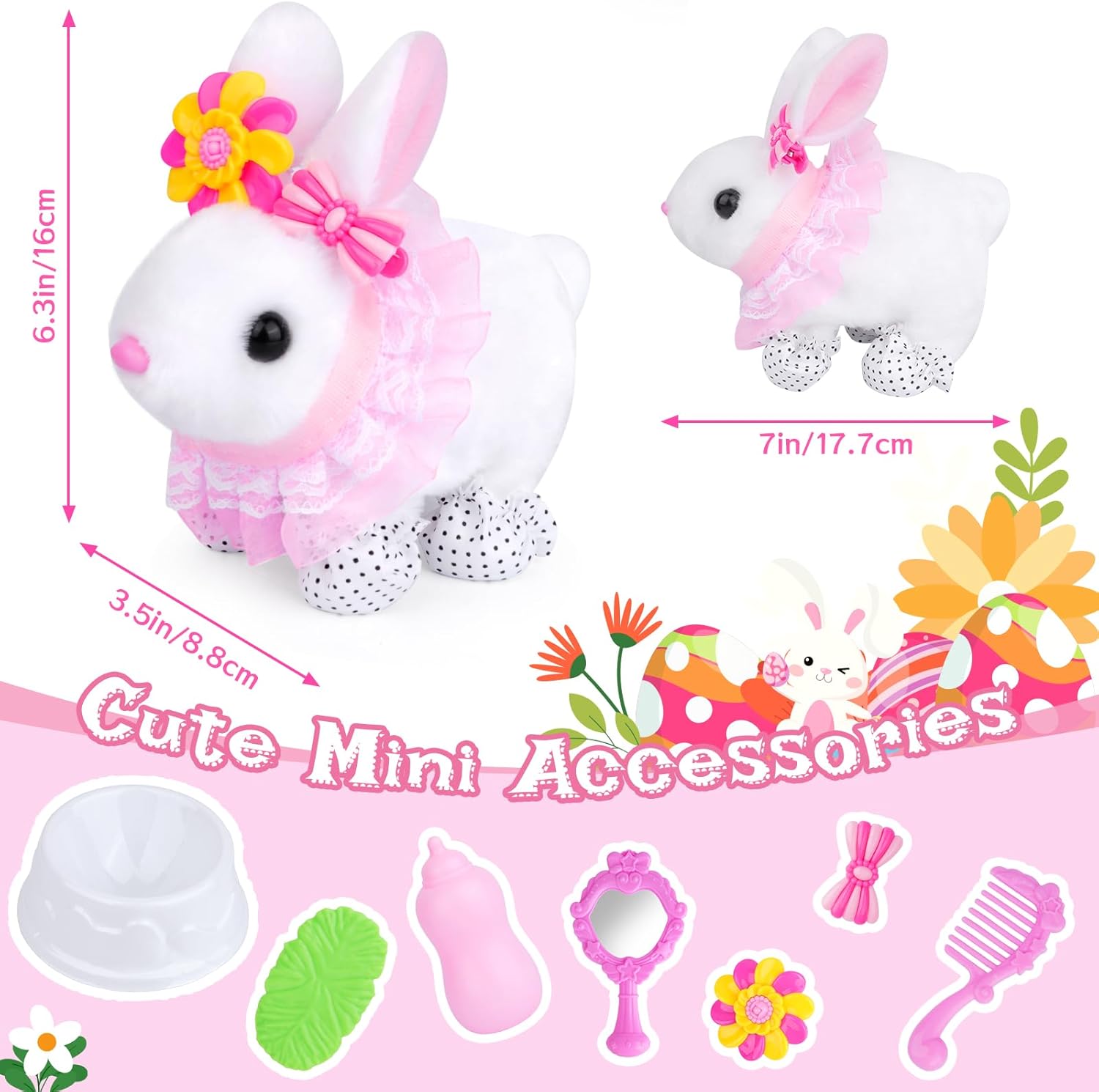 Rich Accessories: In order to let children enjoy the fun of raising rabbits, we also come with a bottle, tub, leather band, hair clips, combs, mirrors, footwear, skirts, children can use their imagination to dress up this electric bunny plush at will