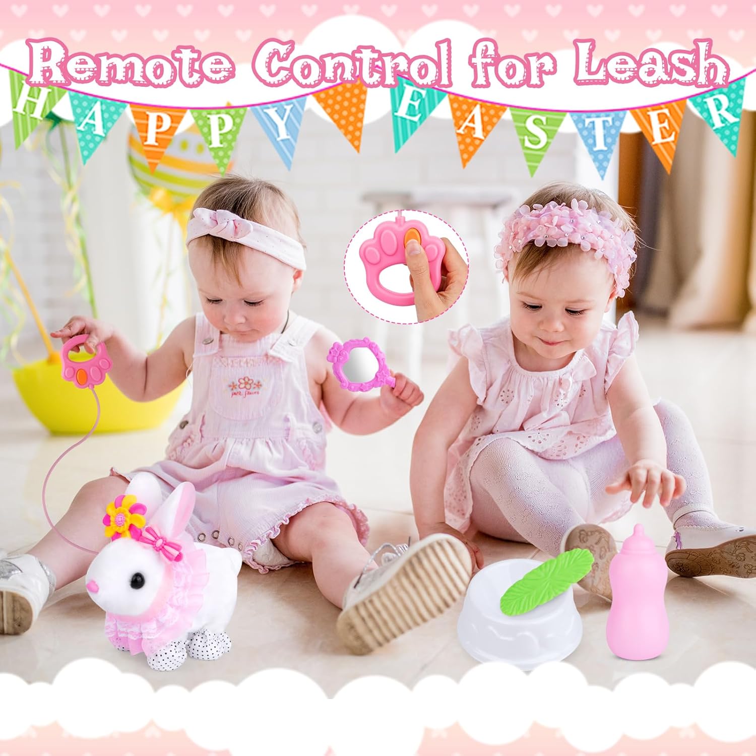 Interactive Walking Bunny Plush Toy: This adorable white bunny plush toy can be made to jump and wiggle its ears like a real bunny with a remote control on the leash, and is accompanied by fun sound effects that will keep your child entertained