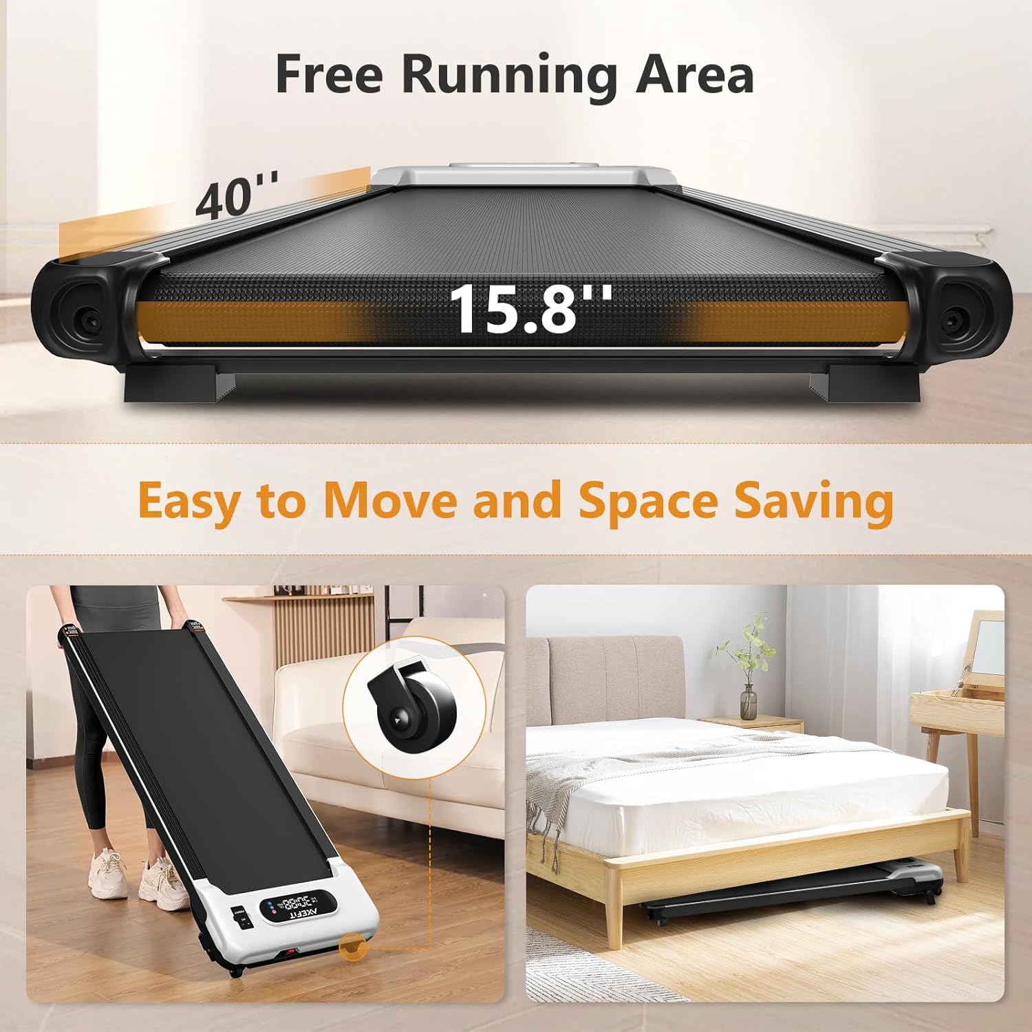 Easy to Move and Store – Thickness of our compact treadmill is only 5.1”, which is easy to be stored under the sofa, desk or bed, making it a great space saver. The walking pad has two wheels on the front side and the machine weighs only 37lbs, so even girls can easily move it to any position you want.