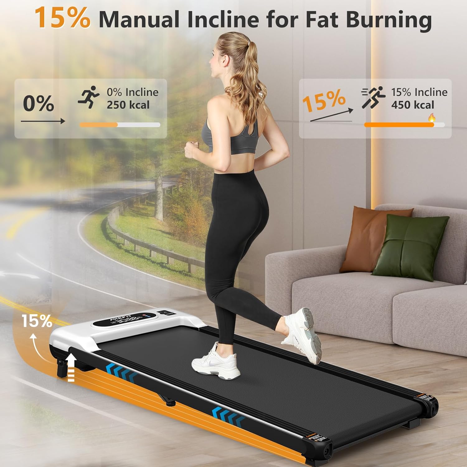 Manual Incline for Higher Fat-burning – Our walking pad under desk is designed with a 15°manual incline, which allows you to activate the incline function in one step without any tools to simulate climbing effect more realistically, and burn an additional 60% calories. This compact treadmill meets your need for higher intensity exercise levels and calorie burning.