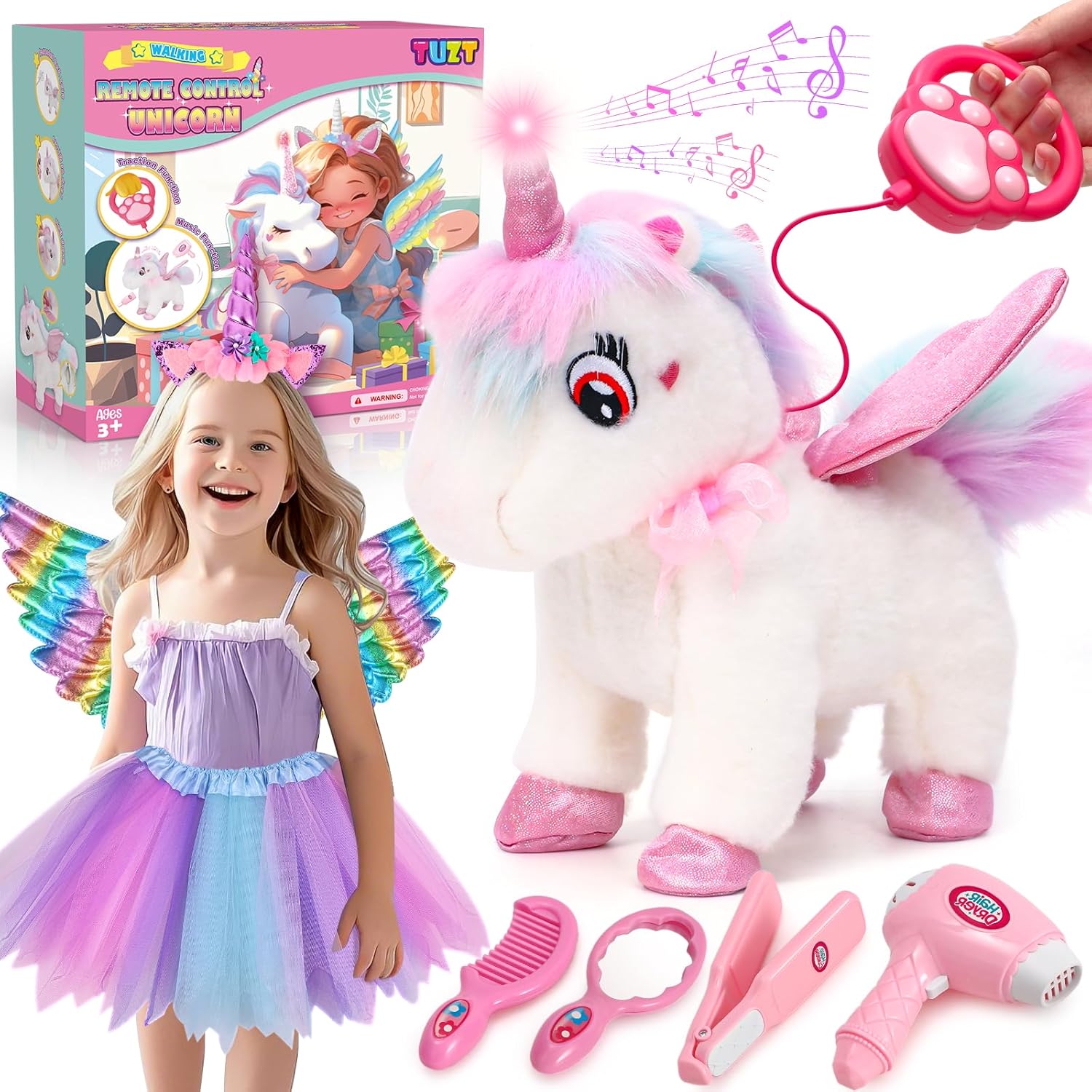 An electronic unicorn, a leash with a remote control handle, an adoption certificate4pcs Costume: tutu skirt, wings, headband, wand4pcs Hair Salon Playset: mirror, comb, hair dryer, hair straightener