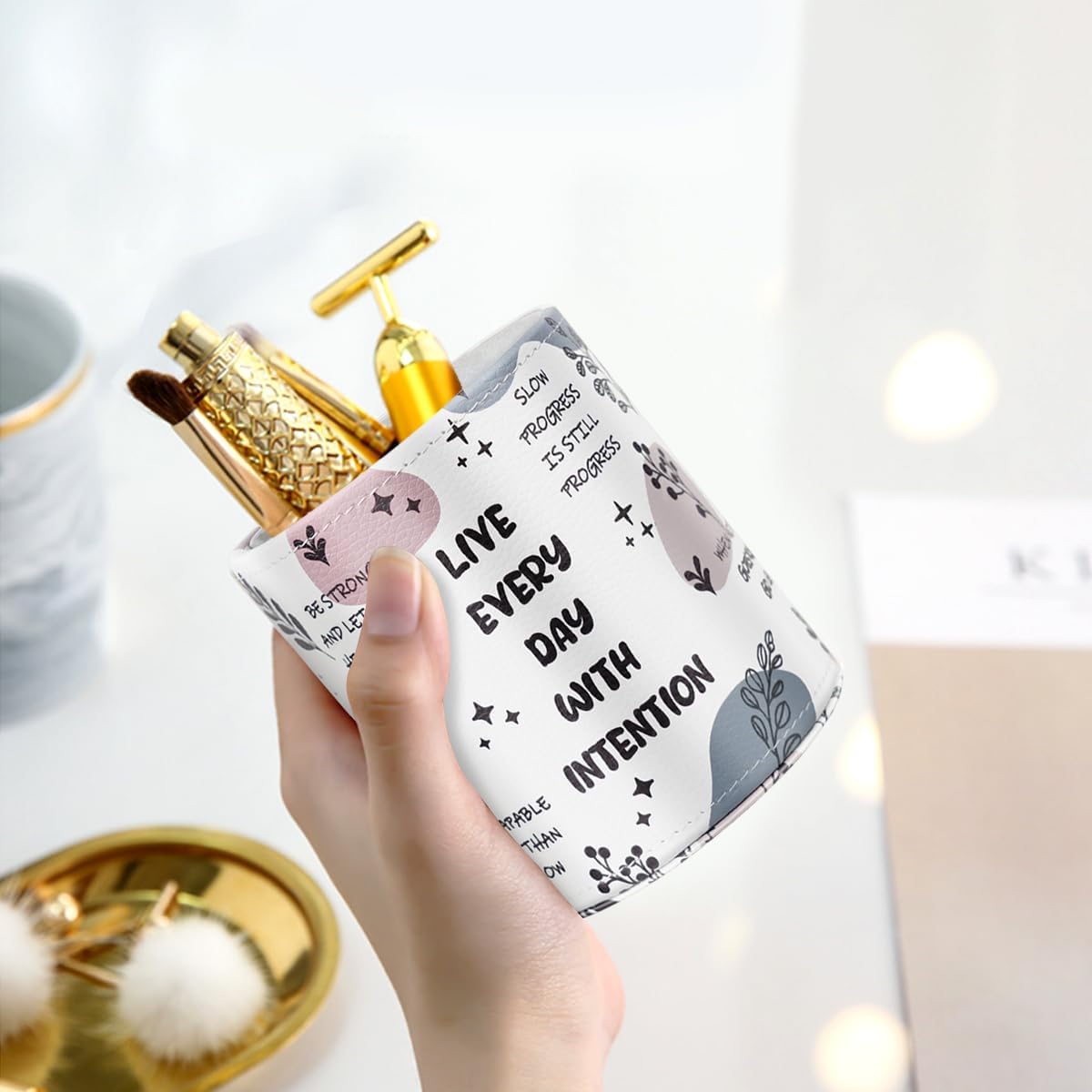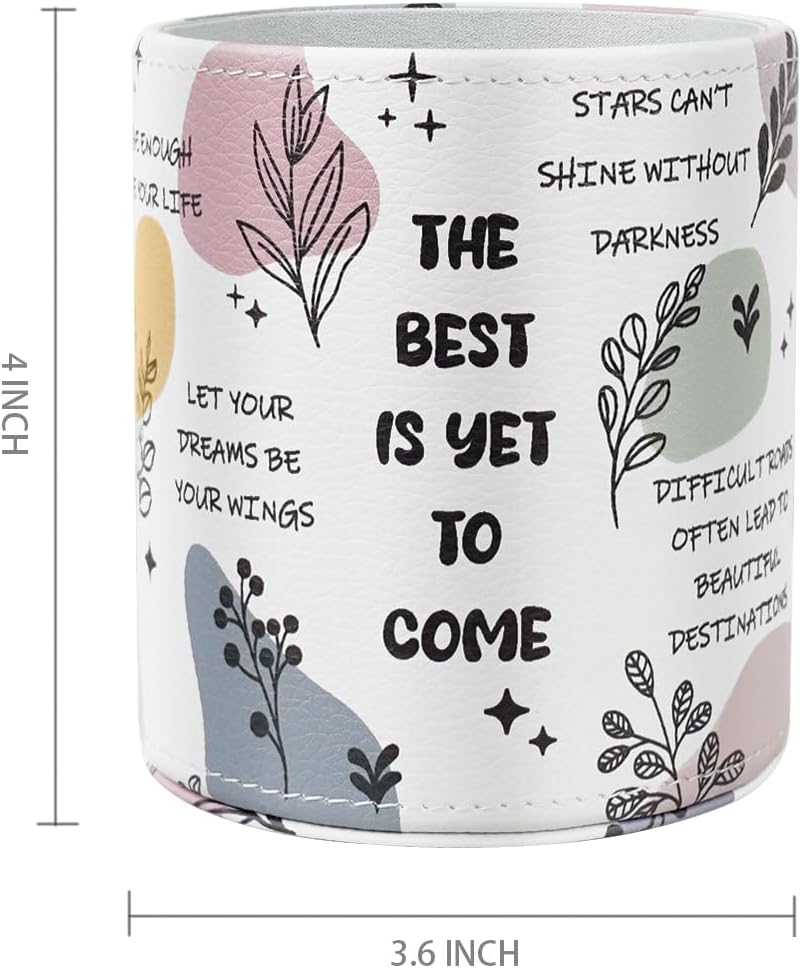 WAVEYU Desk Pen Holder Organizer Cute, Pencil Holder Cup, Makeup Brush Holder Large Pu Leather, Multi-Functional Organizer for School College Office, for Teens Adults Student, Inspiring Words Pattern