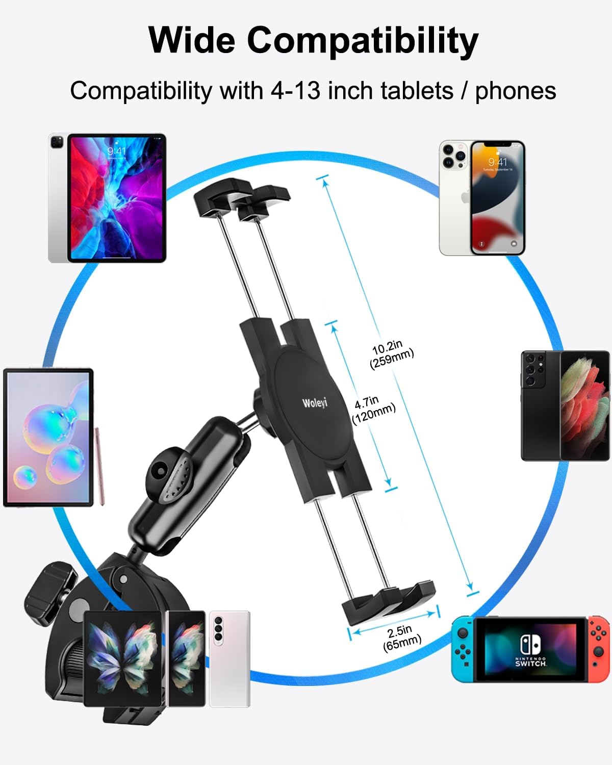 【Compatible Device】This universal handle bar mount tablet holder is compatible with most mobile phones and tablet PCs on the market (4-13 inch devices). Compatible tablets: Apple iPad Pro 9.7 / 10.5 / 12.9 / 13, iPad 1 2 3 4 5 6 7 / iPad Air / Air 2 / iPad Mini 2 3 4 / Apple iPhone 12 Mini, etc. Compatible mobile phones:15 series/14 series/13 series/12 Pro Max, 11 Pro, Xs Xs Max XR X, 8, 7 plus, 6 6s; Samsung Galaxy S3 / Samsung Galaxy S4 / Samsung Galaxy Tab 2, Samsung S10 S9 S8 S7, etc.