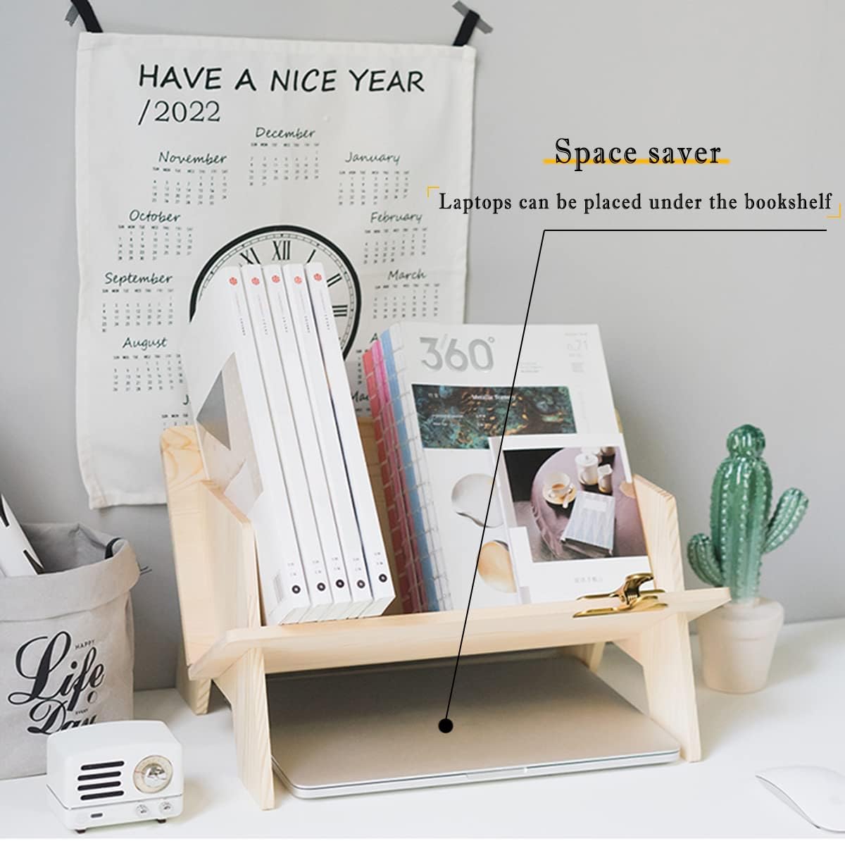 One desktop organizer comes with a large compartment, you can put your laptop under the bookshelf, it is a space saver master.