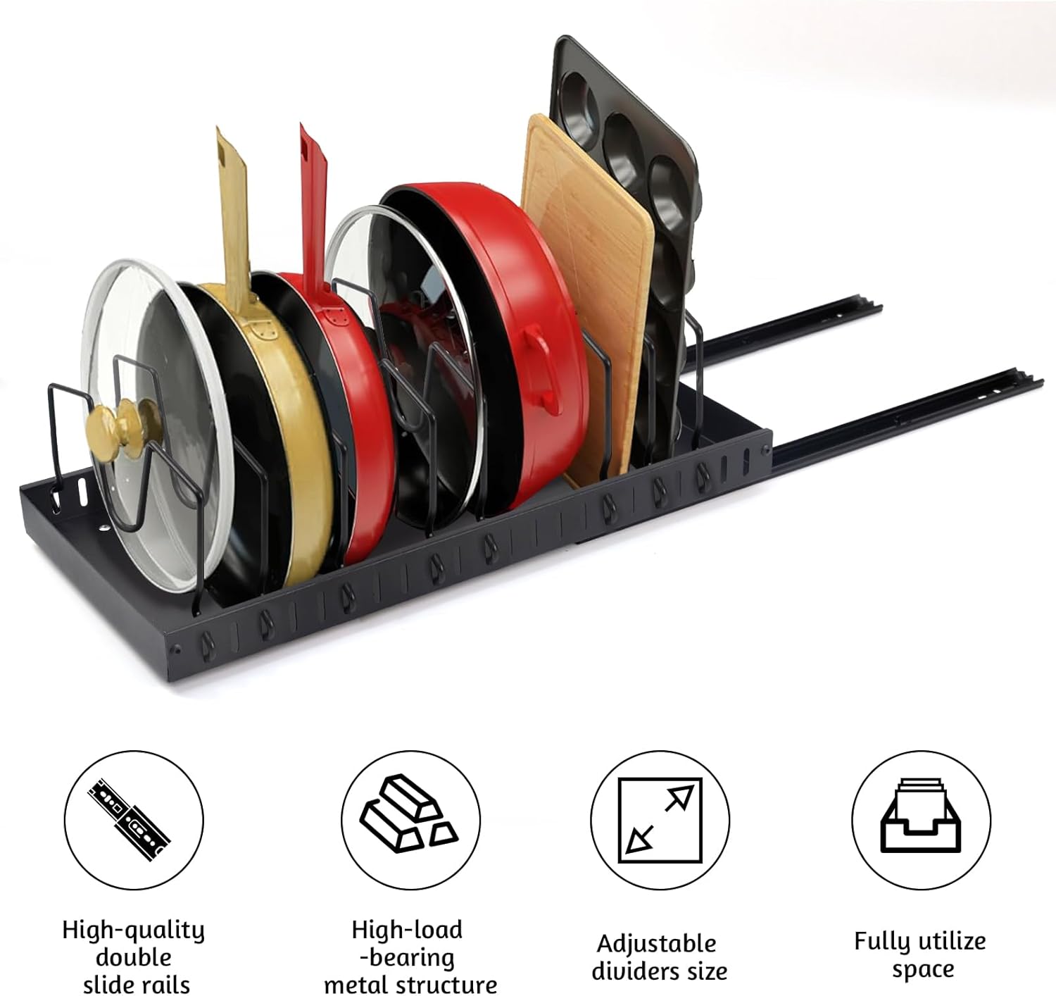 【Adjustable Dividers】With 8 customizable dividers, this pots and pans organizer under cabinet can be tailored to fit various cookware sizes, including flat pans, deep pots, lids, plates, and baking supplies, making organization simple and versatile.