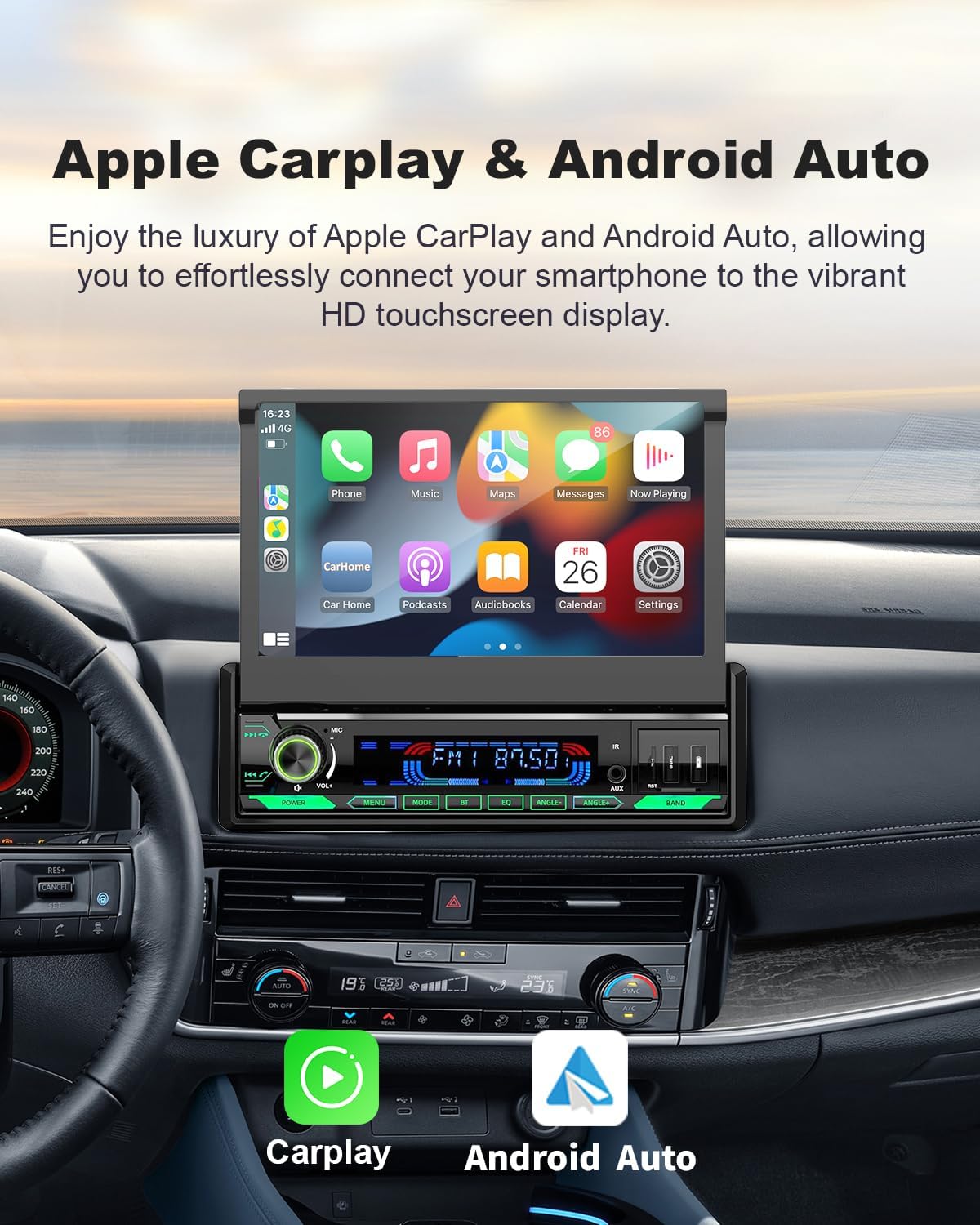 【Wired Carplay & Android Auto Support】Single din car stereo with 7-inch motorized LCD flip-out touchscreen with built-in Carplay and Android Auto, through which voice-assisted control is available on your car radio, giving you easier access to your phone’s features, including music, GPS navigation, calls, notifications, messages and more