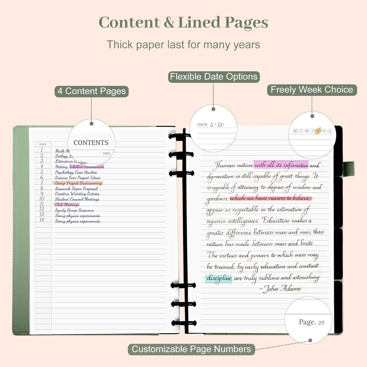 5 Dividers & 16 Tabs: Our multi-subject notebook includes 5 movable dividers that are flexible and durable. You can easily rearrange and organize them. It can be divided into 4 sections, providing enough functionality to sort various subjects and tasks.It comes with 16 tabs to separate information, easy to find categories and organize your notes efficiently