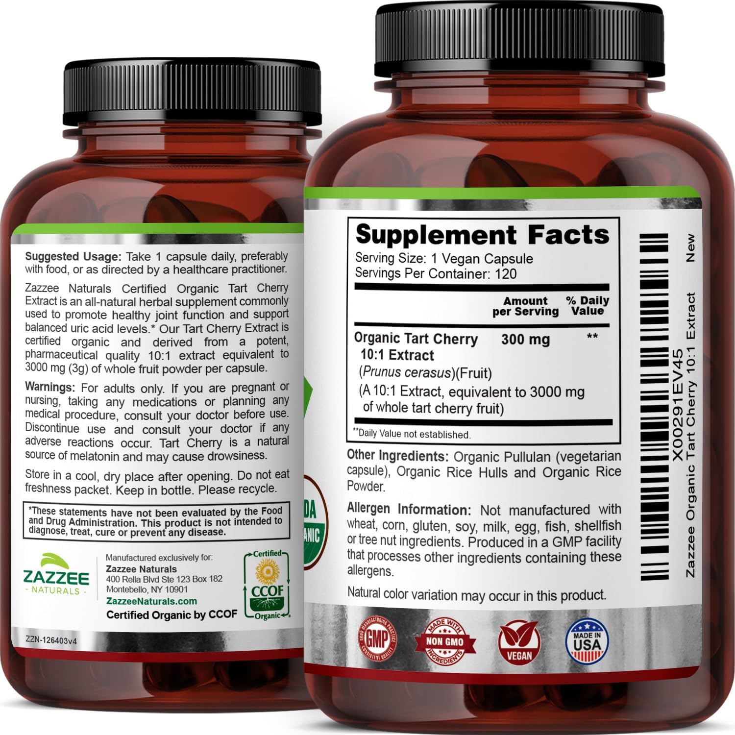 USDA CERTIFIED ORGANIC: With Zazzee Naturals USDA Certified Organic Tart Cherry Extract, you can be sure your Tart Cherry Capsules are organic, all-natural, vegan, and non-GMO. More, while other competing products use various chemicals as fillers, binders, and excipients, our Organic Tart Cherry Extract instead contains only all-natural, organic stabilizers.