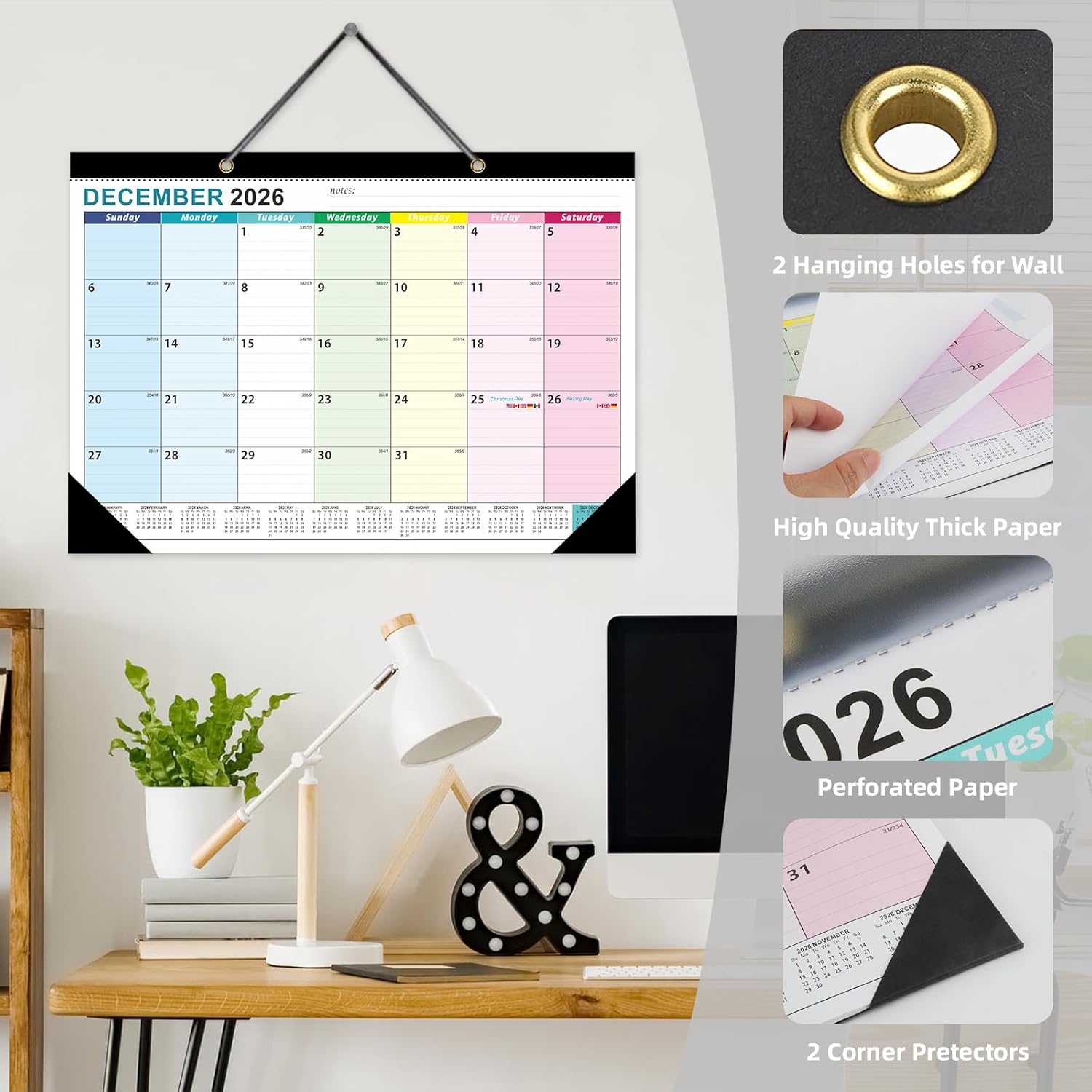 Multi-Functional Hanging & Desktop Use:Dual-hole design for wall mounting and flat-lay corners for desktop stability;perforated pages allow easy monthly removal, while sturdy binding prevents page loss.