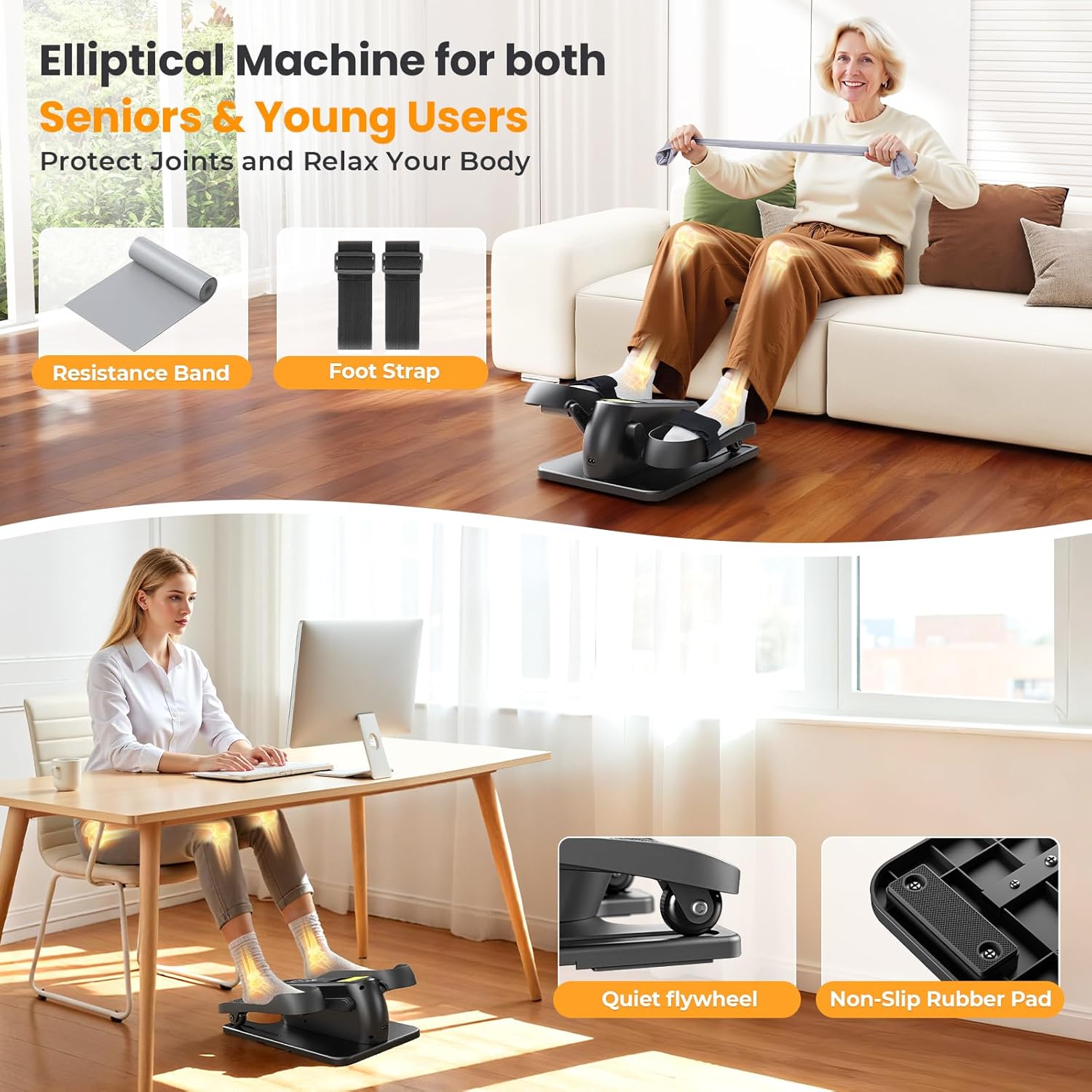 Mini Under-Desk Elliptical: The under desk elliptical is designed with both forward and reverse motion paths to provide a safe, low-impact workout with zero stress on the joints. It’s suitable for seniors, office workers, and in leg rehabilitation. The compact ellipse leg exerciser helps activate multiple muscle groups, boost circulation, and support joint recovery and mobility training