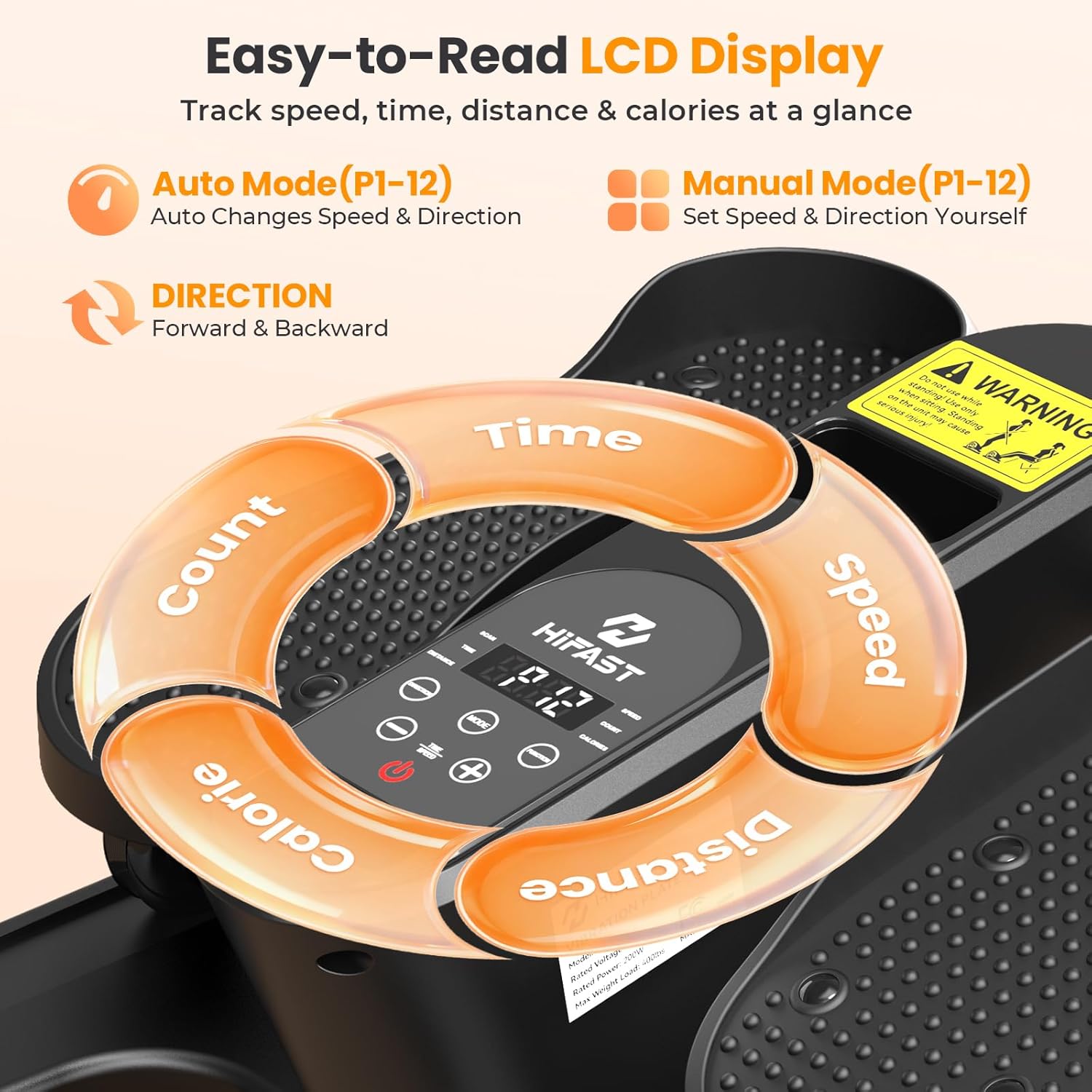 2-in-1 Auto & Manual Modes: Compared other ellipticals with only 3 auto modes, our ellipse leg exerciser as seen on tv offers P1–P12 auto and manual modes. Auto mode automatically switches between forward and reverse every 5 minutes for balanced muscle engagement (direction not adjustable). HR mode allows you to manually select forward or reverse direction and adjust resistance levels. Whether working, reading, or watching TV, stay active while seated